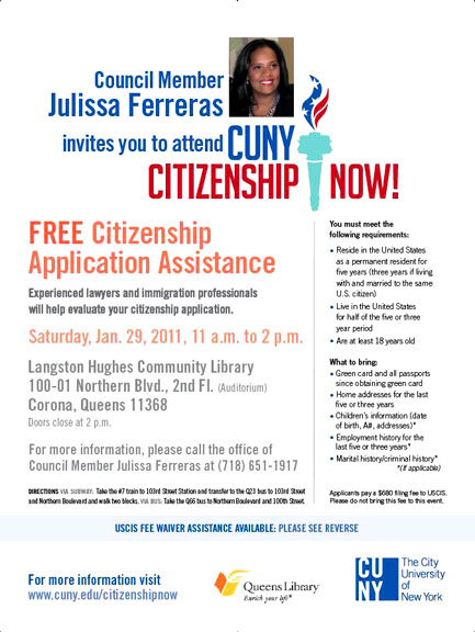Este sábado podrá recibir asistencia gratis para obtener la ciudadanía estadounidense. El evento es organizado por la concejal Julissa Ferreras y es en la biblioteca pública de Northern Boulevard y la calle 100, en Queens. de 11 de la mañana a dos de la tarde. El solicitante tiene que ser mayor de 18 años, tener ‘green card’ por 5 años y deberá presentar algunos documentos para verificar su identidad.