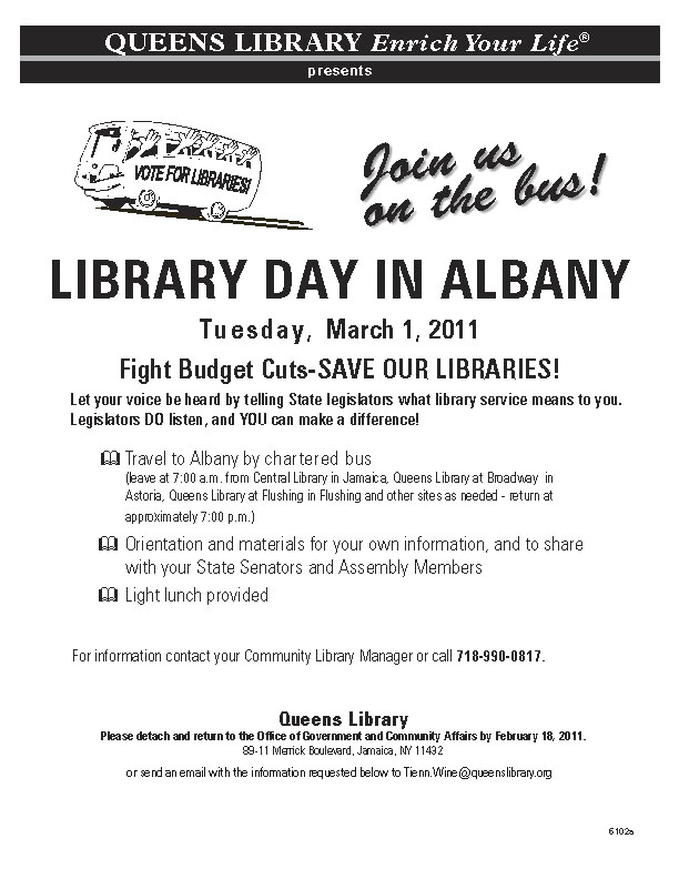 Queens Library es una corporación independiente, sin fines de lucro y no está afiliado con ningún otro sistema de biblioteca. La Biblioteca de Queens presta servicios a una población de mas de 2.3 millones de habitantes en Queens, el condado de los Estados Unidos más diverso étnicamente con 23 millones de artículos en circulación en el año fiscal 2010, la biblioteca tiene la circulación más alta de cualquier otro sistema de bibliotecas en el país. Para más información acerca de los programas, servicios, direcciones, eventos, noticias, visite el sitio de la red (web site) en la siguiente dirección www.queenslibrary.org o llame al 718-990-0700. QUEENS LIBRARY Enriquezca su vida®