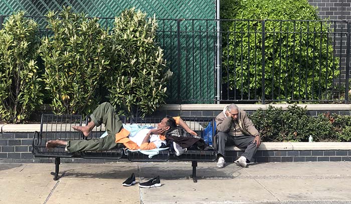Estos do hombres se calientan con los rayos del sol al lado de la entrada principal del Hospital Elmhurst de Queens la primera semana de abril del 2020. Foto Javier Castaño