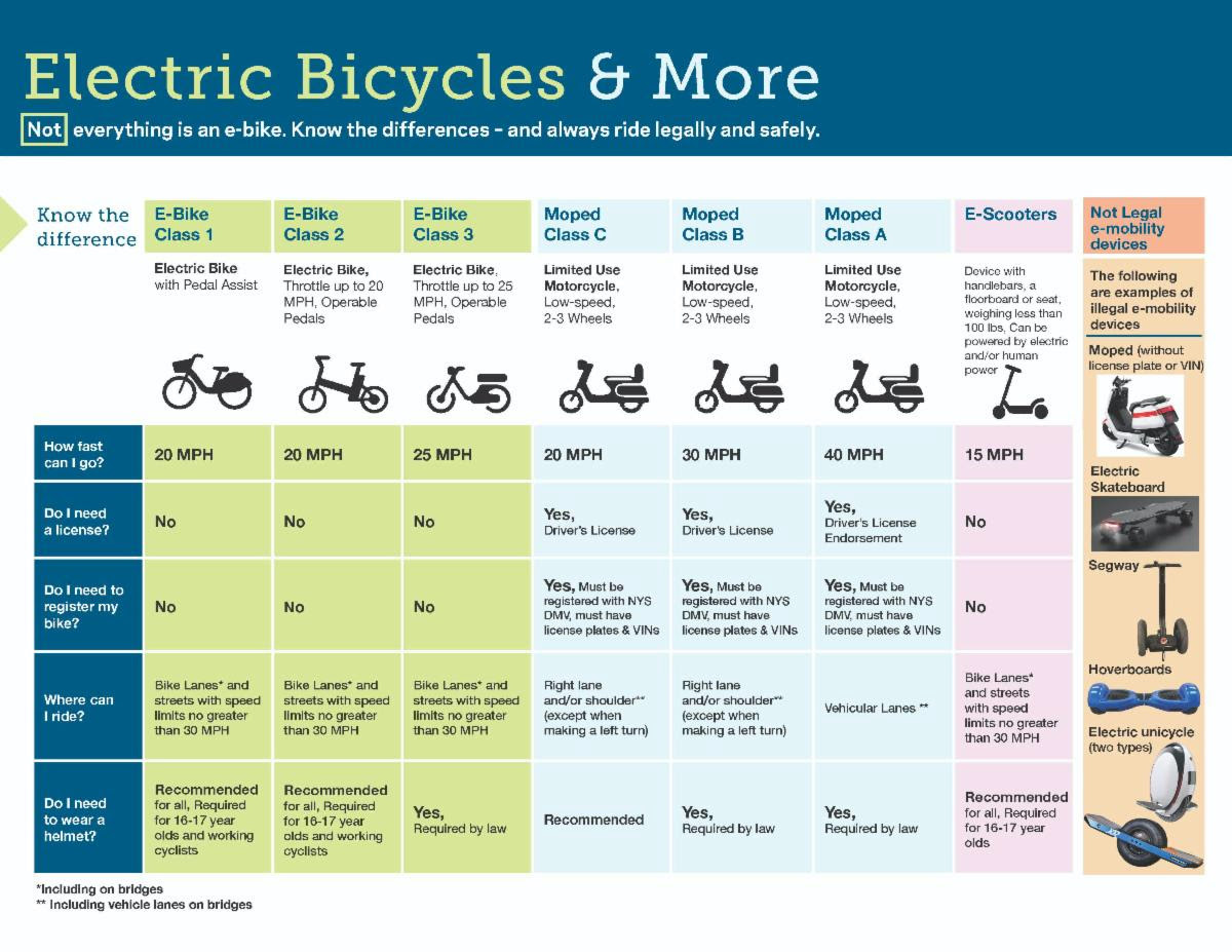 El Departamento de Poicía de la ciudad de Nueva York preparó este gráfico para que sepa qué vehículo usar. Es decir, cuales bibicletas, patineras, motociletas o scooters puede usar sin que reciba una multa.
