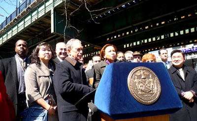El alcalde Bloomberg y la congresista Nydia Velázquez en la plazoleta Manuel de Dios Unánue de Queens hablando del Censo. Fotos javier Castaño