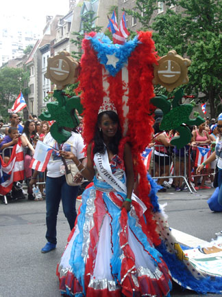 Este desfile fue dedicado al pueblo de Guayama, que vino con sus reinas, sus bandas, sus políticos y una delegación de fútbol (soccer). “Soy de Guayama y estoy aquí para alentar a mi pueblo”, dijo la adolescente Ana Rodríguez mientras exhibía la bandera de Puerto Rico que había tatuado en su pecho. Hacía calor y sudaba.