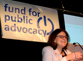 Dr. Gail Mellow dirigiéndose a los asistentes a LaGuardia.