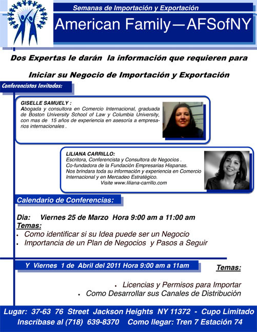 Cómo traer productos a este país y cómo enviar mercancía a Latinoamérica son temas que atraen mucho a la comunidad empresarial latina de New York. Es por eso que Liliana Carrillo experta en el tema estará hablando en la organización American Family, de 9:00 a 11:00 am Los temas son “como identificar si su idea es un negocio” y los pasos a seguir para diseñar su plan de negocios. El viernes 1 de Abril del 2011 sobre Permisos y Licencias para Importar y Exportar y Como crear sus Canales de Distribución.