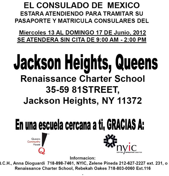 El Consulado Mexicano atenderá en Queens para tramitar el pasaporte y la matrícula consular hasta este domingo 17 en la escuela Renaissance Charter School de la calle 82, en Jackson Heights, Queens.