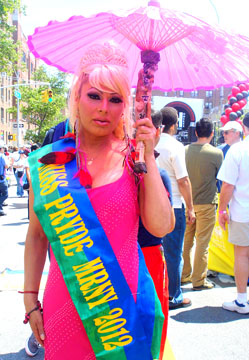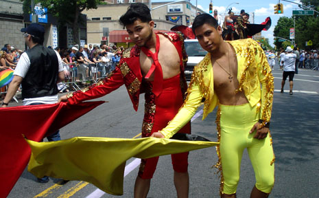 Las banderas latinoamericanas se mezclaban con la bandera del orgullo gay. Bandas de músicos tocaban sus trompetas y tambores. En la calle 85 con la avenida 37 un grupo de porristas de Cheer New York con uniformes rojos practicaban su coreografía lanzando a sus integrantes al aire para después atraparlos en brazos. Drag-queens desfilaban mostrando extravagantes vestidos y hombres desfilaban sin camisa.