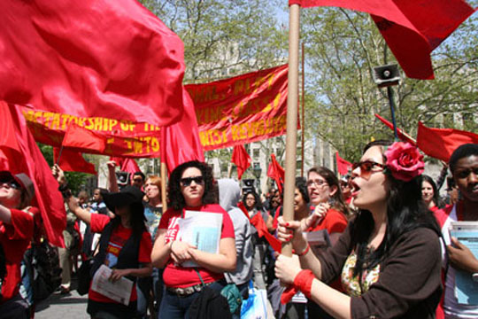 Los sindicatos de Nueva York celebraron el Día del Trabajo con una demostración en el bajo Manhattan. Acudieron alrededor de 4,000 personas que portaron carteles en contra de la guerra y las corporaciones, a favor del Partido Comunista, los derechos sindicales y los inmigrantes.
