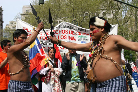 El Grupo de Danzas LIVI (Liga por la Cuarta Internacional) llevó pancartas y a varios hombres que se vistieron de indígenas. Una agrupación interpretó danzas indígenas de México y logró atraer la atención de la multitud, incluyendo a Lucha Brandenburg, que se dedica a forjar cultura bajo el nombre de Besos No Bombas.