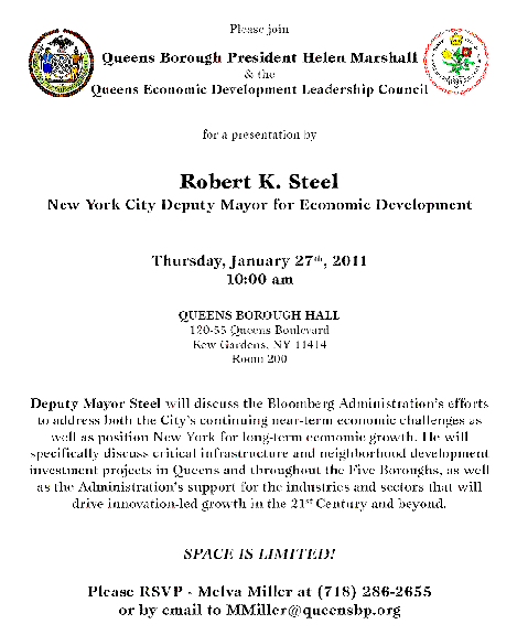 This Thursday at 10 in the morning, Robert Steel, Deputy Mayor for Economic Development will visit Queens Borough Hall to talk about the future of the Big Apple as economic engine for the world. The focus of the discussion is critical infrastructure and neighborhood development. The meeting is open to the public at 120-55 Queens Boulevard, in Kew Gardens, room 200.