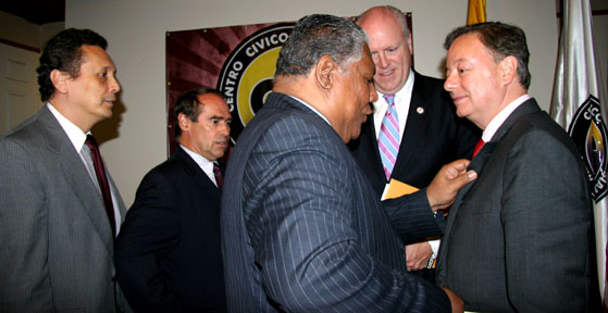 Desde la izquierda, el director del Festival, Adolfo Sánchez, el congresista que representa a los colombianos en el exterior, Jaime Buenahora, el presidente del CCC, Guillermo Lozano, el congresista Joseph Crowley, y el Embajador de Colombia en Washington, Gabriel Silva, en reciente reunión sobre la aprobación del TLC entre Colombia y los EE.UU. realizada en la sede del CCC.