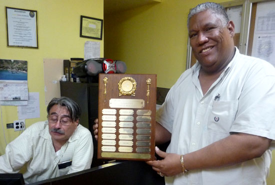 En la sede del CCC en Corona, Queens, a la izquierda, el fiscal Humberto Luque y el presidente Guillermo Lozano sosteniendo una placa con la lista de los socios fundadores. Fotos Javier Castaño