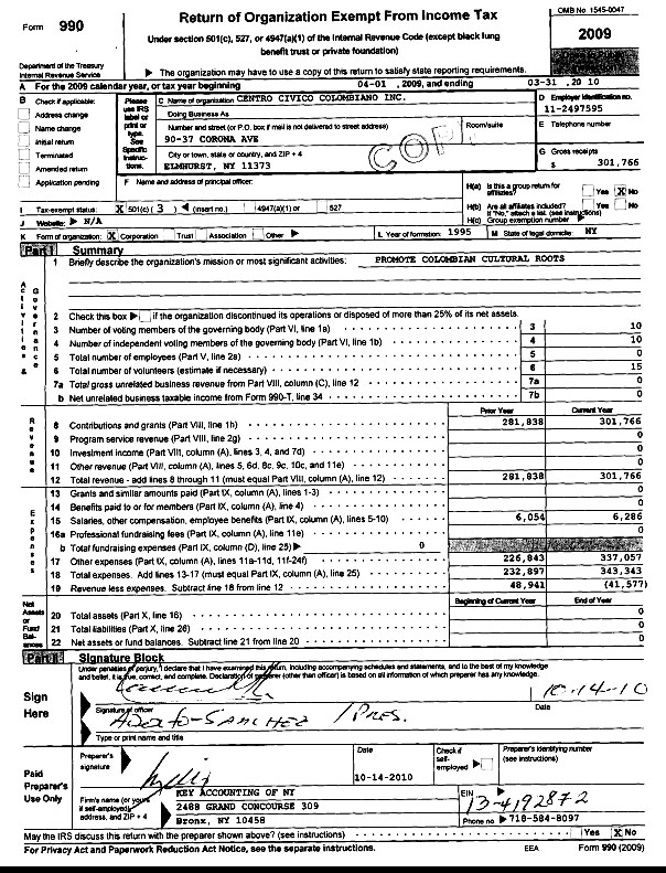 En documento obtenido por QueensLatino.com, la directiva del CCC afirma que en el año fiscal 2009/2010 recaudaron 281,838 dólares y el año pasado esa cifra ascendió a 301,766 dólares. El CCC no ha presentado recibos o comprobantes de pago ni nada parecido. Si hay una investigación y descubren actos criminales, “entonces alguien puede ir a la cárcel” si violaron los estatutos de la institución o las normas del estado. “El CCC no cumplió con todos los requisitos de impuestos, pero ya arreglamos esa situación. Nosotros llevamos las cuentas claras y se las podemos enviar a la Fiscalía”, dijo Sánchez.