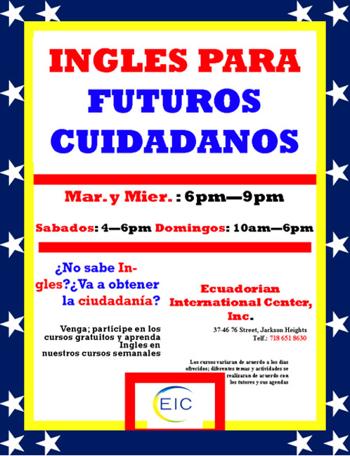 Las clases de inglés son gratis y se imparten en la sede del Centro Internacional Ecuatoriano (EIC) ubicado en el 37-46 de la calle 76, en Jackson Heights, Queens. Son los fines de semana y el teléfono es (718) 651-8630 para que llame antes de acudir a esta organización sin ánimo de lucro.