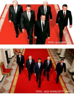El principal diario oficialista egipcio Al-Ahram publicó el martes pasado tanto en su edición digital como en la impresa una imagen del arranque a principios de mes en la Casa Blanca de las conversaciones de paz entre israelíes y palestinos en la que se ve al presidente de Egipto, Hosni Mubarak, de 82 años, abriendo camino sobre una alfombra roja seguido del presidente de EE UU, Barack Obama, del primer ministro israelí, Benjamín Netanyahu, el rey Abdalá de Jordanía y el líder de la Autoridad Nacional Palestina Mahmud Abbas. En la imagen auténtica, tomada por el fotógrafo Alex Wong para la agencia Getty, era Obama el que encabezaba la comitiva. La silueta de Mubarak, no sólo ha sido recortada y llevada a la primera fila, también ha sido rotada en espejo.