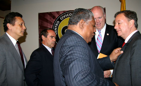 El congresista Crowley fue quien eligió la sede del CCC para esta charla, “porque es una institución a la cual he donado dinero y quería acercarme más a la comunidad colombiana de Queens”. El presidente del CCC, Guillermo Lozano, no habló, pero si le puso en el pecho el escudo de la institución al embajador Silva.