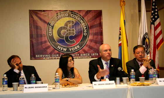 En la sede del Centro Cívico Colombiano se debatió el Tratado de Libre Comercio (TLC) entre Colombia y los Estados Unidos. “Tengo que leer el tratado, avaluarlo y decidir si voto a favor o en contra del TLC con Colombia”, dijo el congresista demócrata Joseph Crowley. Su indecisión sorprendió a los presentes, muchos de los cuales consideraban que votaría a favor y que por eso acudió a la reunión con políticos colombianos.