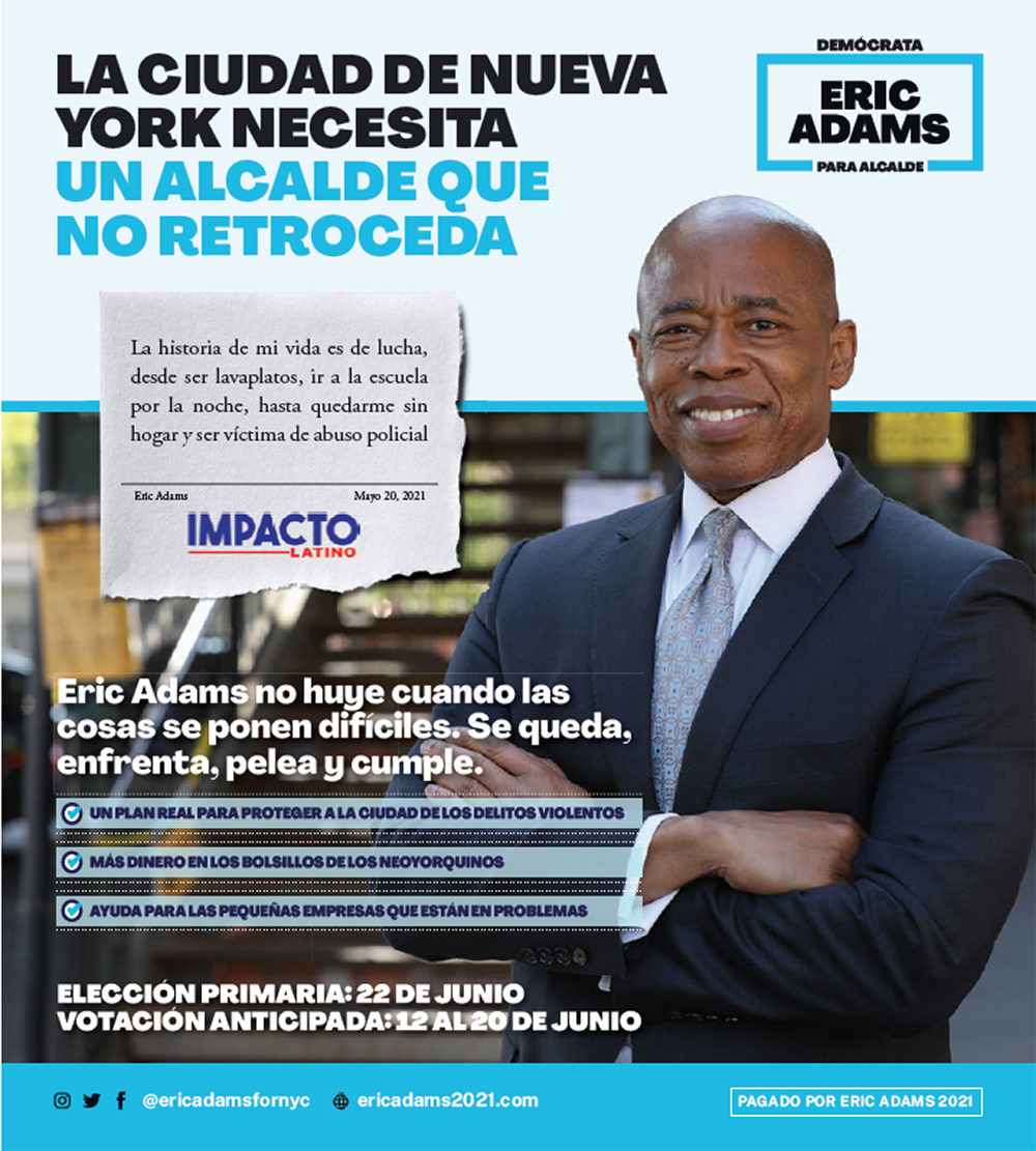 Respaldamos al demócrata Eric Adams para que se convierta en alcalde de la ciudad de Nueva York. Hacemos un llamado a los votantes latinos para que escojan a Adams como su candidato número uno en las próximas elecciones primarias del martes 22 de junio.