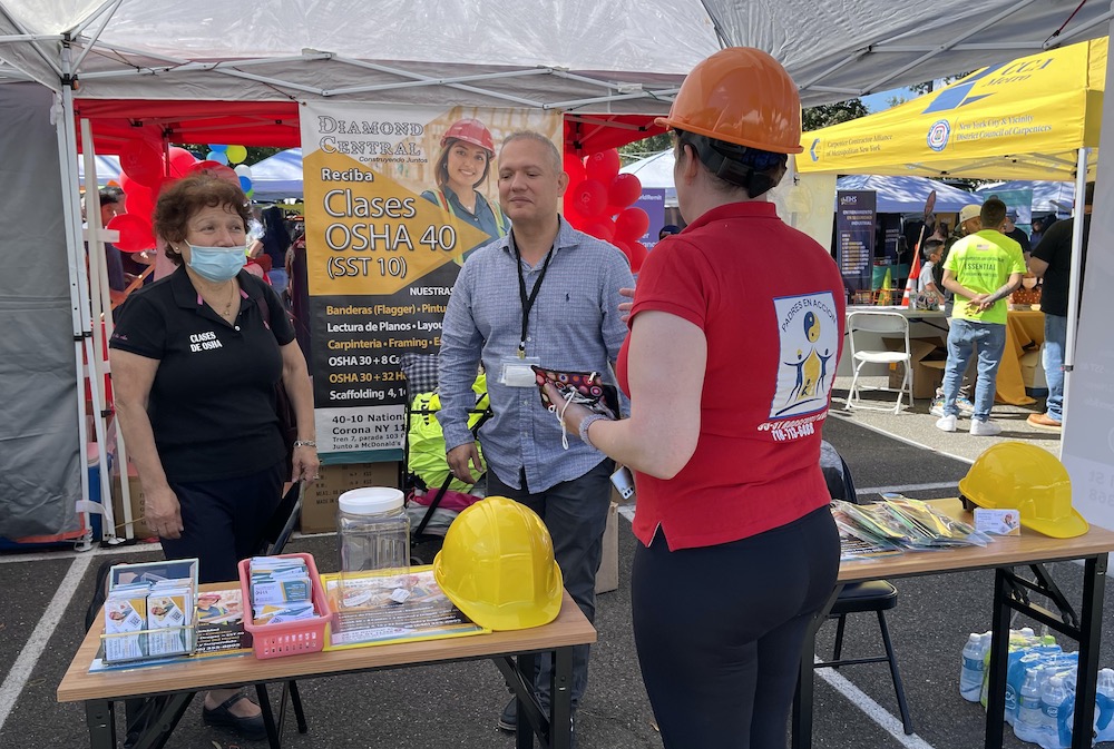 Etrusco Bini, al centro, de Diamond Center que dicta clases de OSHA, hablando con una representante de Padres en Acción, que también instruye a obreros de la construcción.