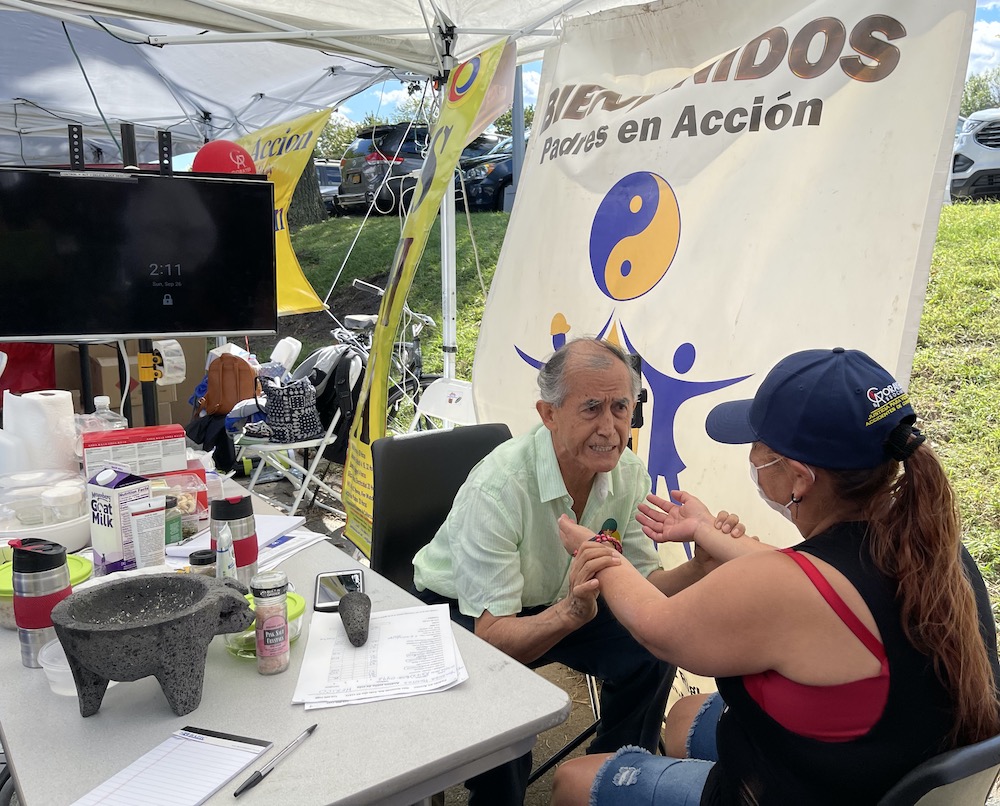 El naturista Manuel Pinzón examinando a un latina para recomendarle qué hacer y qué comer con el fin de llevar una vida sana y plena.