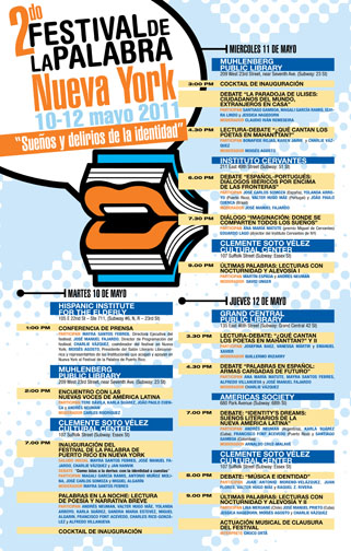 “Festival de la Palabra” atrajo más que 20,000 seguidores en el Viejo San Juan el año pasado y viene a Nueva York este mayo. Más que una docena de lecturas y debates están planificadas, combinando periodistas, escritores y poetas de Argentina, Brasil, Chile, Colombia, Cuba, la República Dominicana, Portugal, Puerto Rico, Spain y los EE.UU.