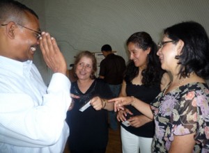 Luis Parra, contador de Inversionistas Unidos, conversando con Zulma Grisales de Inversionistas Unidos, Ursula Avelino de Andes Investments, y Miriam Bedoya, también de Inversionistas Unidos.