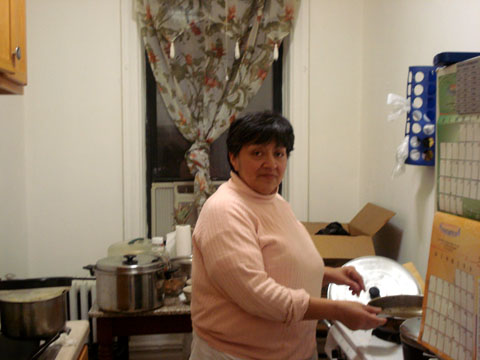 Dentro de su apartamento en el primer piso de un edificio de Jackson Heights, Pinto prepara comida para vendérsela a otra persona.