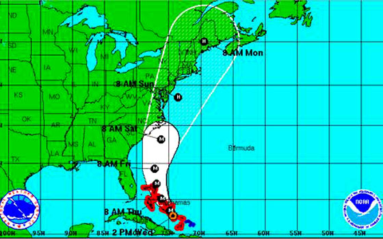 De acuerdo con los pronósticos, el miércoles en la noche el ojo del huracán pasará por el sureste y centro de Bahamas, y el jueves se hallaría sobre el noroeste de las islas.