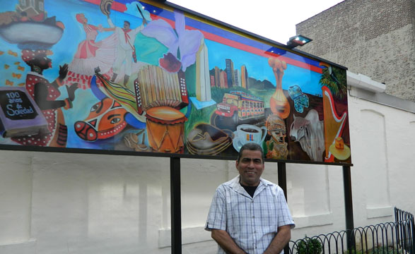 Hugo Sandoval, artista plástico nacido en Barranquilla, Colombia y radicado en Nueva Jersey por más de 30 años, es el artista que concibió el mural. La pareja bailando cumbia, la palenquera vendiendo frutas frescas en las playas de Cartagena, el acordeón, la panorámica de Bogotá, el edificio Coltejer de Medellín, las sierras, los llanos, el arpa y el café. Entre trazo y trazo de colores y formas Hugo Sandoval logró mezclar las diferentes expresiones de la cultura de su país.