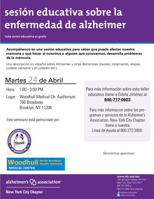 Para alertar a la comunidad sobre los riesgos del alzheimer y qué podemos hacer si estamos perdiendo la memoria o algún ser querido está siendo afectado por esta enfermedad. La reunión es en el Hospital Woodhull de Brooklyn este próximo 24 de abri, de 1 a 3 de la tarde.