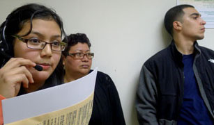 En el rincón desde donde se hicieron las traducciones, Jennifer Tenezaca, de NICE, Teresa Arieta de NYCPP y Andrés García, de NICE. Fotos Javier Castaño
