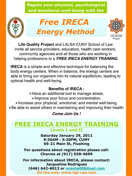 La técnica de IRECA es un método para obtener energía de manera práctica y útil. Puede ayudar a la gente a mantenerse bien y mejorar la calidad de vida. El curso se ofrecerá en Flushing, Queens, el 29 de enero de este año y es gratis para personas que trabajan en medicina o programas sociales, como profesores, enfermeras, trabajadores sociales, etc.