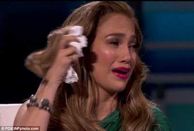 JLo. dijo que no podía más y la cámara de televisión enfocó su rostro mientras escurría lágrimas. Sus labios rojos contrastaban con su traje verde que dejaba ver sus piernas hasta mucho más arriba de la rodilla. El programa American Idol se realiza en Las Vegas y es transmitido por Fox (canal 5 en Nueva York) a nivel nacional.