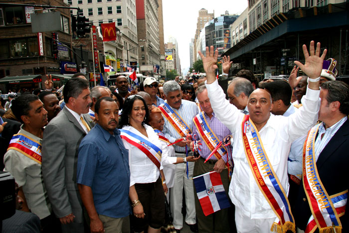 Parte del liderazgo dominicano alrededor del alcalde Bloomberg: el asambleísta Espaillat al extremo izquierdo y Nelson Peña al derecho. Foto Javier Castaño.