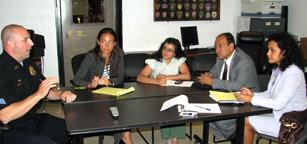 El sargento John White de Peekskill hablando con el Cónsul General de Ecuador en NY, Jorge López y con representntes de la firma de abogados Arrufat Gracia.