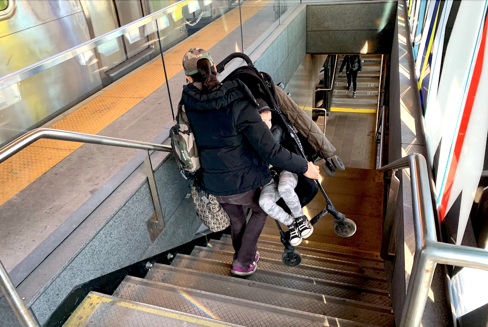 Una latina con su hijo en el coche descendiendo las escaleras en una estación de trenes de Queens. Foto José Martínez/THE CITY