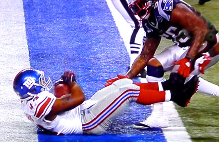 El ataque llegó hasta las diagonales con 57 segundos por jugarse con un acarreo seis yardas en el que Ahmad Bradshaw dudó por un segundo anotar el touchdown o quedarse en la yarda uno al ver que los Patriots le permitieron entrar para intentar una última ofensiva con un tiempo fuera y algo en el reloj.