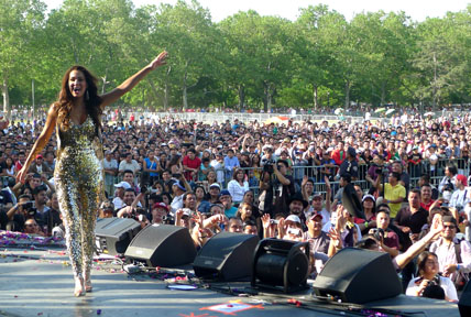 El periódico QueensLatino.com repartió en la tarde 2,000 ejemplares en el Parque Flushing con historias de la creciente comunidad mexicana en Nueva York. En la portada está La Nena, Iliana Sánchez, vistiendo un traje de diosa azteca.