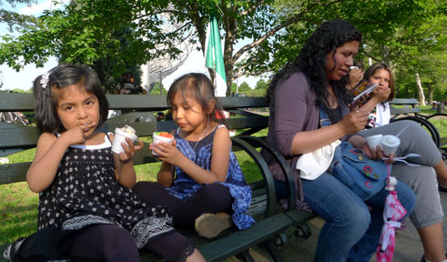 Las niñas Joanna y Rosy Vivaldo disfrutaron de un helado cerca de la bandera de México y la réplica de la esfera del fundo.
