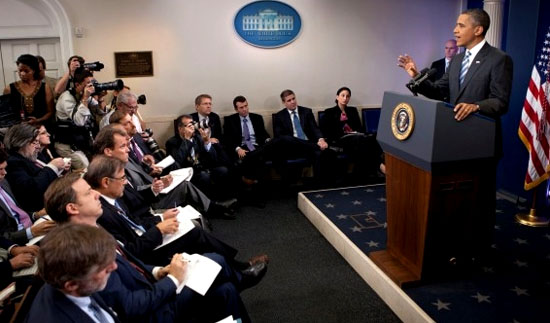 - Obama hablando con los periodistas en la Casa Blanca.