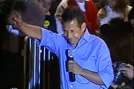 En su primera aparición pública luego de la difusión de los primeros resultados oficiales de la Oficina Nacional de Procesos Electorales (ONPE), Ollanta Humala agradeció el apoyo a las millones de personas que votaron por él asegurándoles que su único compromiso es con el pueblo peruano.