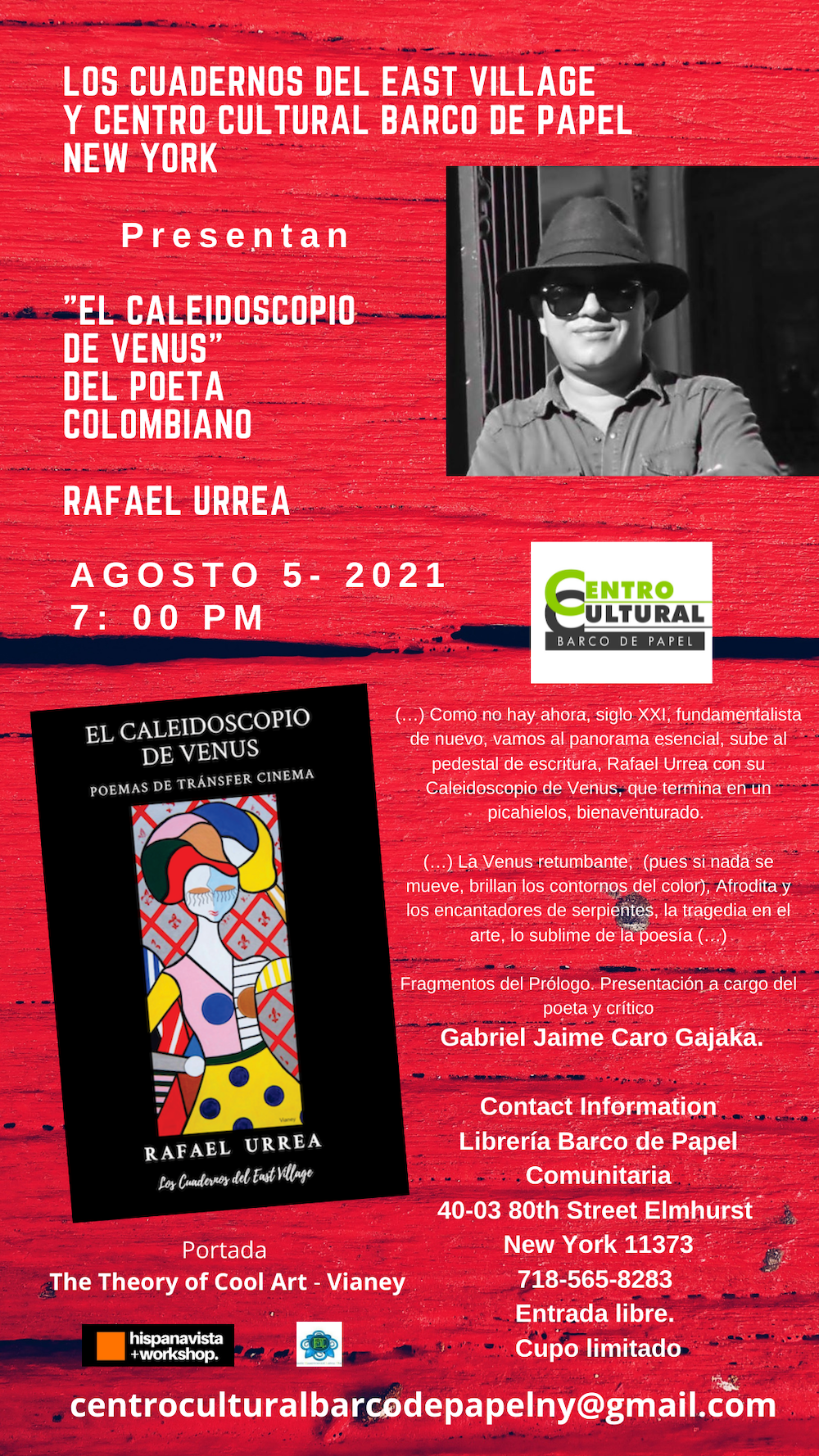 El Caleidoscopio de Venus, poemas de Tránsfer Cinema con prólogo del poeta y crítico Gabriel Jaime Caro (Gajaka) y Jorge Flórez y con diseño de portada de Cool Art by Vianey será lanzado en el Centro Cultural Barco de Papel Comunitario localizado en 40-03 80th Street Elmhurst, NY 11373 el próximo 5 de agosto a las 7:00 pm. Entrada libre, cupo limitado.
