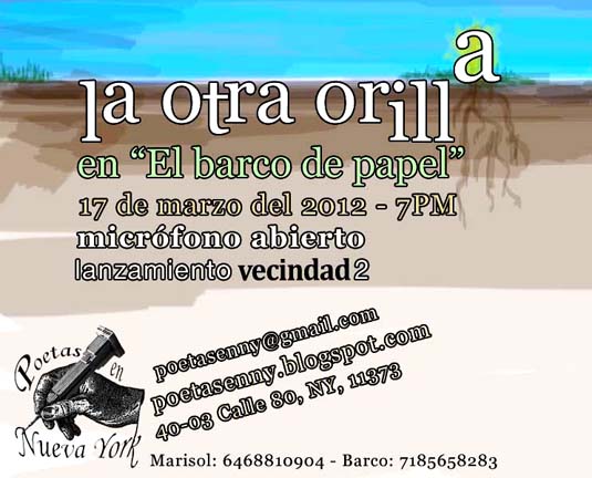 El colectivo ‘Poetas en Nueva York’ invita una vez más a los escritores y comunidad en general a encontrarnos por primera vez en este 2012 en ‘La Otra Orilla’, a realizarse el próximo 17 de marzo del 2012 a las 7 p.m. en la librería ‘El Barco de Papel’ ubicada en la: 40-03 Calle 80, N.Y. 11373.