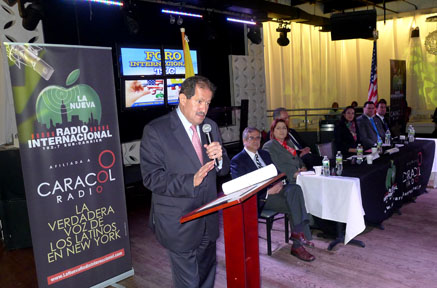 Los 103 colombianos que acudieron al foro sobre el TLC en el centro nocturno Fiesta de Woodside, Queens, aplaudieron al vicepresidente Garzón. Algunas personas hasta se pararon de sus sillas. “Yo necesito un amigo en las Naciones Unidas”, dijo el congresista de Nueva Jersey Albio Sires, de origen cubano. “El TLC ha elevado a Colombia al mismo nivel de los Estados Unidos”, dijo el congresista Sires y la gente se volvió a parar de sus asientos. Luego le entregó al vicepresidente Garzón una carta de apoyo a su candidatura a la dirección del OIT y dijo que la enviaría a muchos políticos, como a la Secretaria de Estado Hillary Clinton.