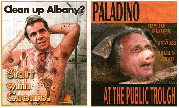 Sin embargo, en la televisión los ataques han sido constantes y han surgido varios volantes en donde los dos políticos caracterizan a su oponente con calificativos degradantes. Paladino ha sido caracterizado como un cerdo que no paga impuestos y Cuomo como un criminal que necesita bañarse para limpiar sus actos.