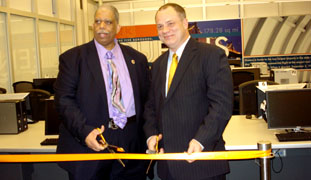 NY City Council Member Leroy Comrie toured the new Cyber Center at Queens’ Central Library, with President/CEO Thomas W. Galante. The new Cyber Center has 72 computer workstations, printers, a scanner, and computerized scheduling. The new facility is more than double the size of the previous Cyber Center. All workstations are for customers to use, free of charge with their Queens Library cards.