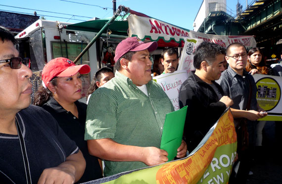 Los esposos Julio y Clementina Hernández, dueños del camión-restaurante Antojitos Tía Julia, que vende tacos, si asistieron a la reunión con los miembros de la prensa. “Deben de aprobar esta ley que otorga días de enfermedad a los trabajadores”, dijo Julio Hernández. “Cuando uno de mis empleados llama enfermo, yo le pago sus 9 dólares por hora de trabajo”. La pareja tiene otro restaurante con el mismo nombre en Sunnyside y en total poseen ocho empleados.