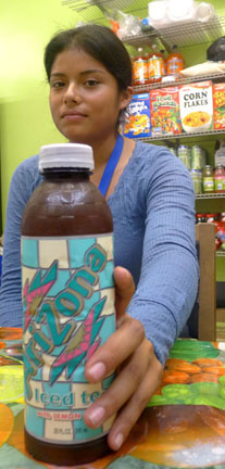 Lady Jiménez, de 19 años, está con Ahuati. “Siempre consumo bebidas grandes con amigos y familiares y no entiendo por qué quieren prohibirlas. Es una decisión familiar y nadie tiene porque meterse”, dijo Jiménez, cuya familia toma a la semana entre 4 y 5 botellas gigantes de Snapple o de Sprite.