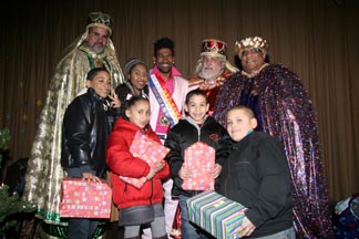 Jesenia Filomeno con los Reyes Magos y algunos de los niños que recibieron regalos.