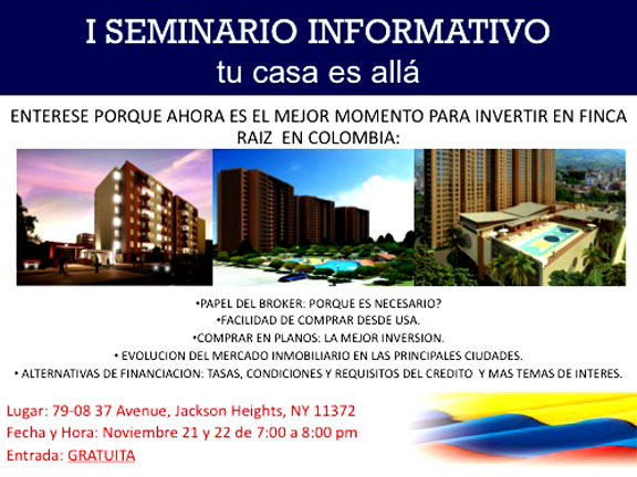 Si desea comprar vivienda en Colombia, este seminario le explicará el porque “es el mejor momento para invertir en finca raíz en Colombia”. Se hablará de temas como los pasos que debe seguir, las alternativas de pago y la evolución de este mercado en expansión. El seminario es el 21 y 22 de noviembre, lunes y martes, en Jackson Heights, Queesn. La entrada es gratuita. Es de 7 a 8 de la noche en su sede de la 79-08 de la 37 avenida.