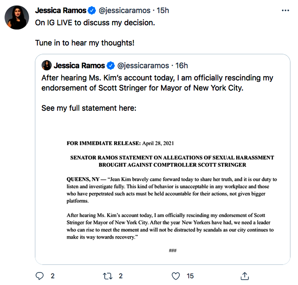 Este es el twitter de la senadora Jessica Ramos y su comunicado de prensa distanciándose del candidato a la alcaldía Scott Stringer:
